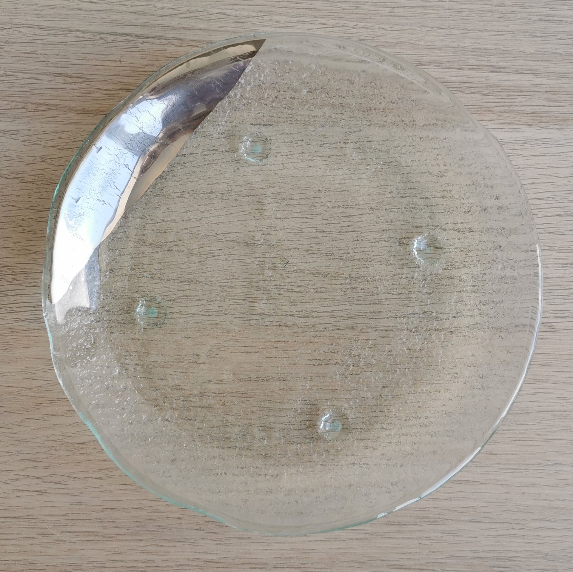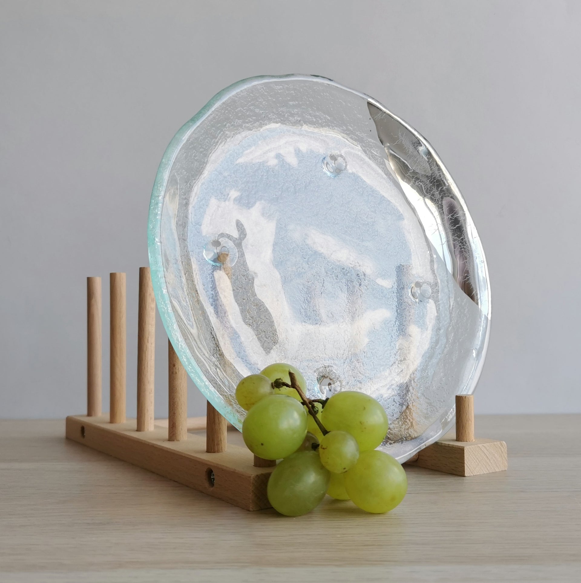 This expressive minimalist handmade fused glass dessert plate will state your perfect elegant taste at the table. Meals served in this plate look like a piece of art. The fine creative look of it follows the latest trends in dinnerware design. It is a result of lots of years of experience in working with glass.